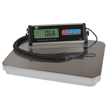 Stabil paketvåg. Den stora bakgrundsbelysta LCD-displayen är lätt att avläsa även på avstånd. Vågplattan är 40cm x 35cm. Vågen mäter i kg och pound. Adapter ingår, vågen kan även användas med batteri (6 x AA) men batterier ingår inte. RS-232 interface. Tillsammans med vågen medföljer det beslag.